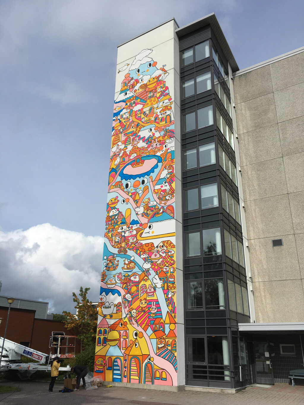 Organised since 2017, the UPEA urban art festival has produced murals for numerous locations in Finland. In 2017, Lahti received two murals. One of them, a cartoon-like piece by Hong Kong arts collective Messy Desk, has since become a colourful and unrivalled landmark on Ritaniemenkatu street in Mukkula. Because the mural is located across from the neighbourhood school, dozens of schoolchildren pass it every day.