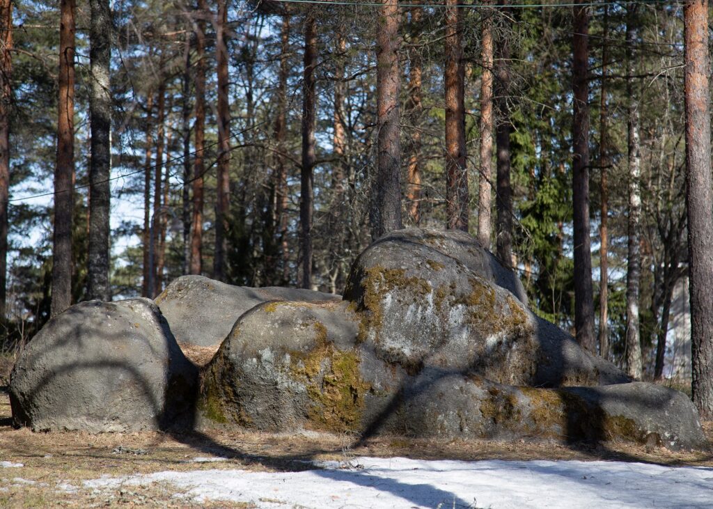 Faceless human figures that blend into the material they are made of are a familiar motif in Olavi Lanu’s works. Such figures can also be found on the Radiomäki hill, curled up, lying on the ground or on a pedestal, either sitting or gathered in a group. Made of fibreglass and concrete, the sculptures combine natural motifs with human ones, with Lanu’s characteristically intriguing and fragile style merging with a laborious and demanding sculptural technique that mimics natural surfaces. Blending in with their surroundings, the mysterious figures can come as a surprise to visitors who encounter them for the first time.