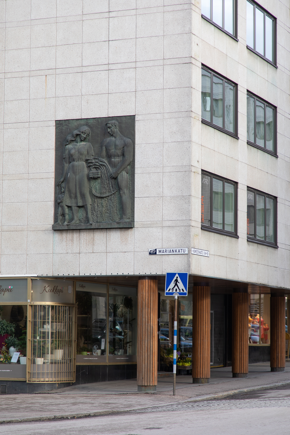 Sadonkorjuu-niminen reliefi sijaitsee Osuuspankintalon rakennuksen kulmauksessa toisen kerroksen korkeudella ja suuntautuu Mariankadulle päin. Veistos on tällä hetkellä Osuuspankin omistuksessa.