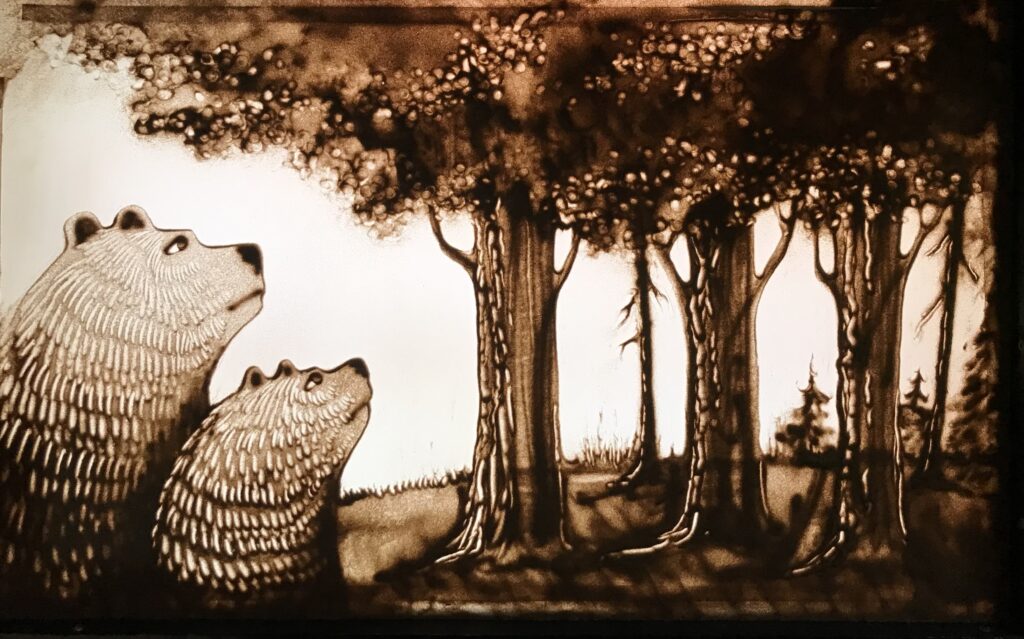 Koko perheen hiekka-animaatioesitys karhujen kotimetsästä. Emokarhu ja pentu asuvat iloisena metsässä, kunnes heidän kotimetsänsä kaadetaan. Karhut ovat neuvottomia ja surullisia, kunnes pieni perhonen tulee karhujen avuksi.