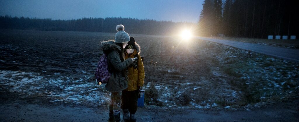 Kuva: Hilma ja Lilja Pielan koulumatka aamuhämärässä. 2017. Kuva: Mirja Hussain