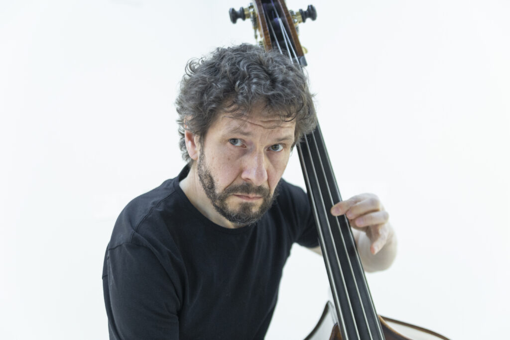 Kokonaisvaltainen taidekokemus näyttelytilassa kontrabasson mukana.